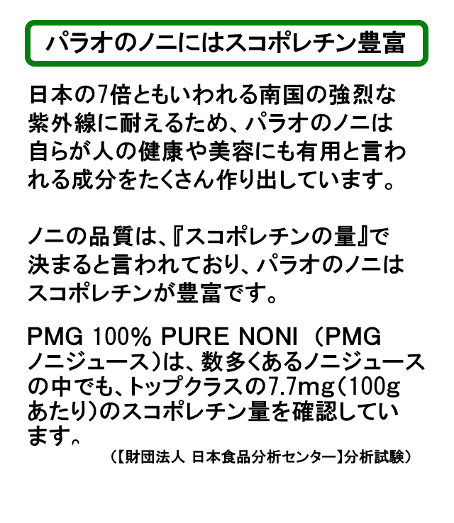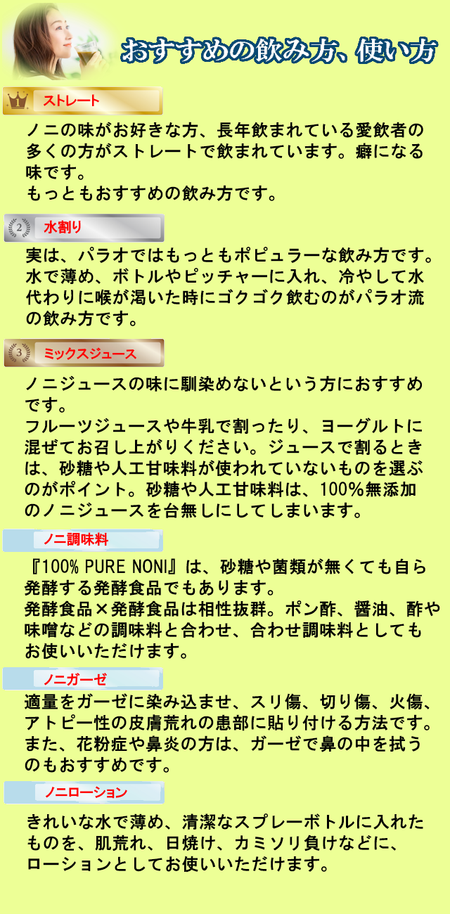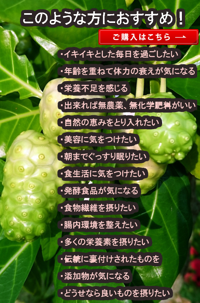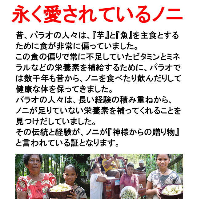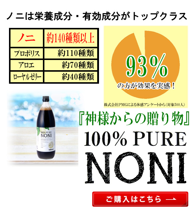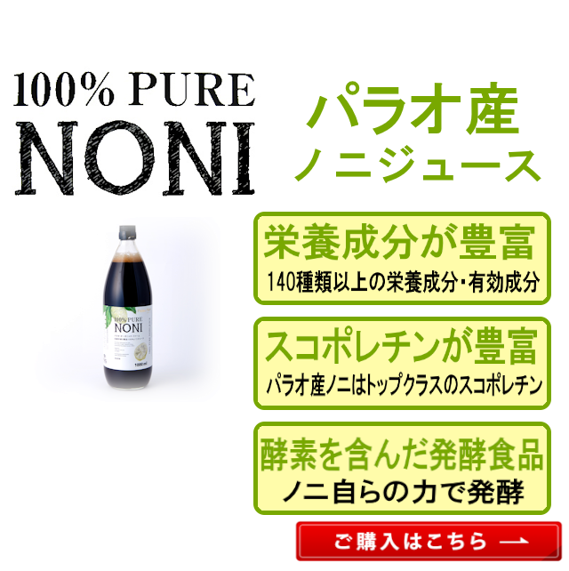 パラオ産高品質ノニ果実を丁寧に手絞り、栄養豊富なパラオ産ノニジュース『100% PURE NONI』の購入はこちらから。↓