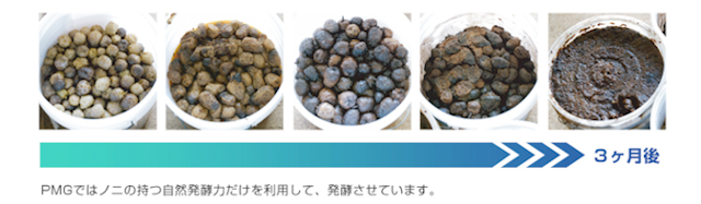 酵母菌などは加えず、ノニ果実の酵素だけで三か月以上発酵・熟成させているので、ゆっくりと果実が液状化し、栄養素がジュースに溶け込んでいきます。