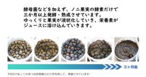 ノニジュースの何が凄いかというと、微生物の力を借りずとも、自ら発酵・熟成しているというところです。