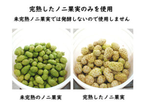 食品を発酵させるには、原料の野菜や果物だけでは糖分が足りないので、麹菌、酵母、納豆菌や酢酸菌、砂糖を使い、発酵させるのですが、ノニは、酵母菌や糖類、水などを使わなくても、完熟すると自己活性酵素でノニ自らが発酵します。何も加えなくても、完熟したノニ果実は発酵をはじめるので、その必要がないのです。