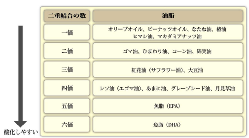 この不飽和脂肪酸は、悪玉コレステロールの除去、動脈硬化を予防する働きがありますが、「高温になる、古くなる、光にあたる、空気にふれる、金属や塩類にふれると酸化し、酸化すると毒性のある『過酸化脂質』に変化してしまいます。酸化させるので、体にとってはサビのようなものです。
