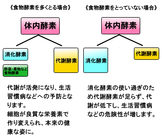 命を維持していくのに大切な酵素ですが、酵素を作っていくのにも限度はあります。そこで、消化酵素や代謝酵素に負担をかけないように食物酵素で体でつくられる酵素のサポートをするのはとても大事です。代謝酵素の中には、病気にかかりにくくする酵素もあるので、代謝酵素を補うための食物酵素が少ないと、病気に対抗する力も弱くなるということにもなります。また、食物酵素の力を借りず、消化酵素だけでは消化しきれなかった血中の脂肪分が血液の状態を悪くし、生活習慣病を引き起こしたり、老化を早めたりもします。