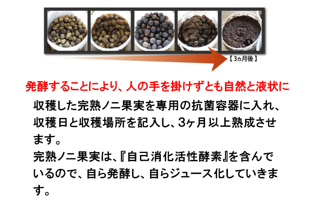 そして、ノニ果実は完熟すると、ノニ自身が持つ自己消化活性酵素の働きで自らを発酵させていきます。