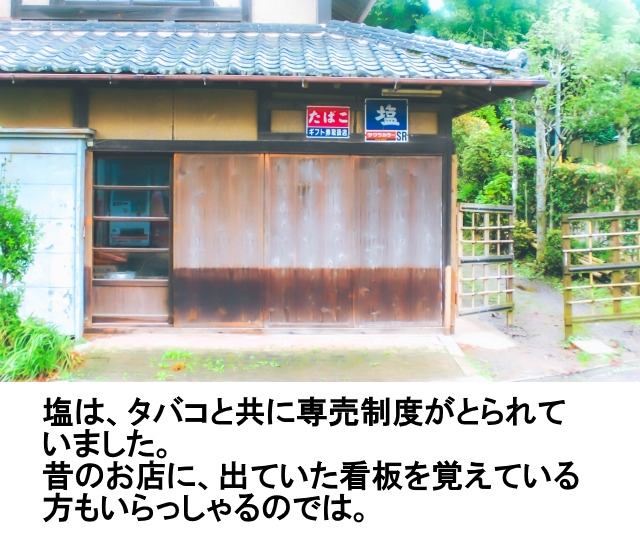 今でこそ、自然塩もお店に並ぶようになりましたが、明治38年(1905年)から始まった塩専売制度で、平成9年(1997年)に廃止されるまで、塩は国の管理下で専売制度がとられていました。