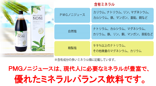 『100%PURE NONI』は、パラオ共和国の土壌にも関連していると思うのですが、多くのミネラル成分を含んでおり、このミネラル成分は自然塩のミネラルと似ています。