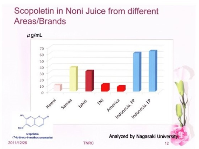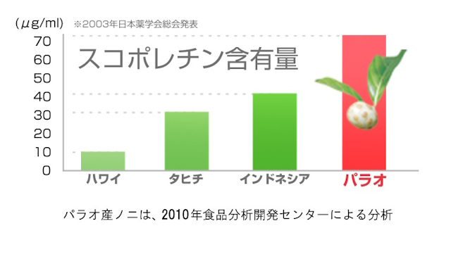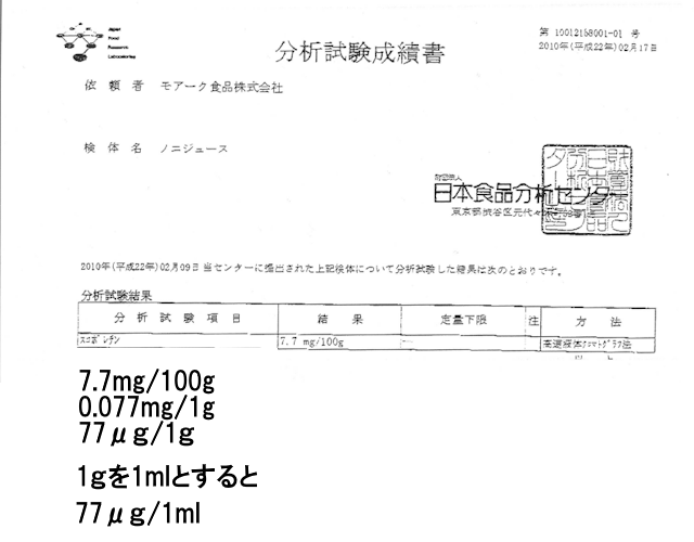 財団法人日本食品分析センターの分析によると、パラオ産ノニのスコポレチンは77μg/mlでした。