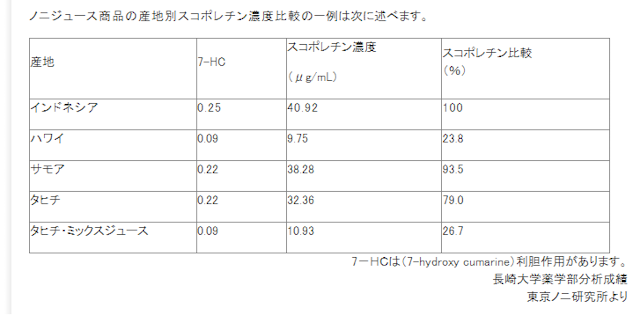 調べてみると、スコポレチン量を公表しているのは余りなく、ノニジュースの決め手はスコポレチンと謳っているところは多いですが、具体的な数値を出しているところは多くないです。