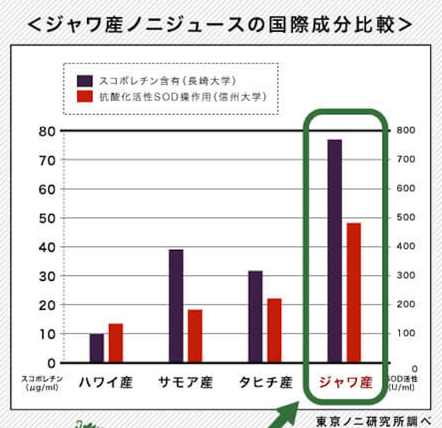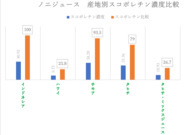 ノニの成分調査に関しては、長崎大学が主流なのか、長崎大学と東京ノニ研究所というのはよく見かけます。ノニジュース産地別スコポレチン濃度のグラフは、このグラフと同じ数値になっています。