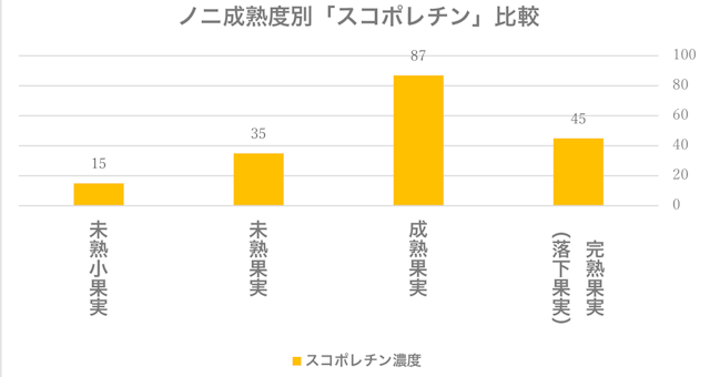 これを見ると、やはり、成熟した果実に一番多いことが分かり、落下前の成熟ノニだけを使った『100% PURE NONI』にはスコポレチンが多いということが分かります。