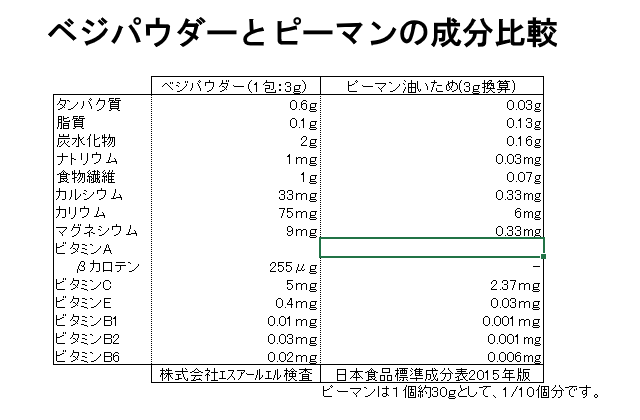 オーガニック・ベジ・パウダーと子供が嫌いであろうピーマンとで成分を比較してみました。