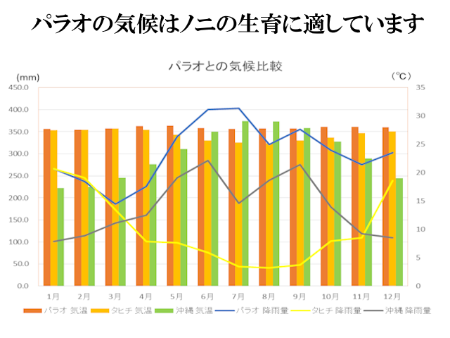 パラオはノニの栽培に適した地域です。パラオは熱帯気候で、高温多湿の環境がノニの生育に適しています。パラオの気候は年間を通じて温暖で、降水量も十分にあるため、ノニが健康に育つための条件が整っています。また、パラオの土壌もノニの栽培に適しているため、ノニの産地として適しています。